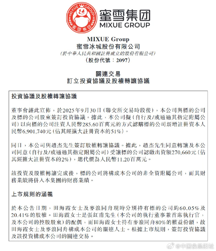根据中国食品新闻社的说法,Mixue Ice City Co.,Ltd。他于10月1日宣布,他将于9月30日在市场后与Fulzia de Beer Fresh达成投资协议并转让股票,并在大约2.97亿EWAN中收购了Fulzia新鲜啤酒的资本。完成投资后,Mixue Group产品类别将从新鲜的水果饮料,茶水,冰淇淋和咖啡中扩展到新鲜啤酒,进一步适应消费者对高质量和负担得起的产品的共同需求,并履行“为世界各地享受负担得起的美味佳肴的使命。”根据数据,整个家庭着重于“新鲜啤酒全家”品牌,该品牌以6-10元的单位价格提供500毫升新鲜啤酒,将损失变成2024年的利润(不包括1,0.7亿税后的净利润)。截至2025年8月,在全国28个州已部署了1200名DAS。这项交易被认为是重要的t测量混合冰城以扩展其产品。进入啤酒卡车时,您可以利用供应链和品牌的潜力来探索新鲜啤酒行业的新增长机会。据洪兴首都办公室称,Mixue Ice City和Lucky Cafe等新鲜的Beer Fulu家族已经采用了特许经营模式来扩展其商店网络。产品价格类似于冰之城混合的价格和幸运咖啡馆的价格。除了丰富产品类别外,促进特许经营业务也可能是进行这项投资的原因之一。 Shanxi证券研究报告认为,Mixue Group未来的三个主要增长点是Mix Ice City的市场加密内部,这是运气命运的特许经营计划以及东南亚市场的扩张。截至2025年6月30日,Mixue Group拥有超过53,000个StorES在世界范围内和中国有48,281家商店。在2025年上半年,Mixue Group的收入为148.7亿元人民币,年际交往增加了39.3%。其中,产品和设备的销售收入为1449亿元人民币,比上一年增加了39.6%。特许经营和相关服务的收入为3.8亿元人民币,比上一年增加了29.8%。关于毛利率,在2025年上半年,商品和设备的销售毛利率为30.3%,特许经营和相关服务的毛利润额为82.7%。作为一家综合公司,Full Family Store的增长还为Mix Group提供了好处。资料来源:中国吉普伊新闻社会食品新闻社